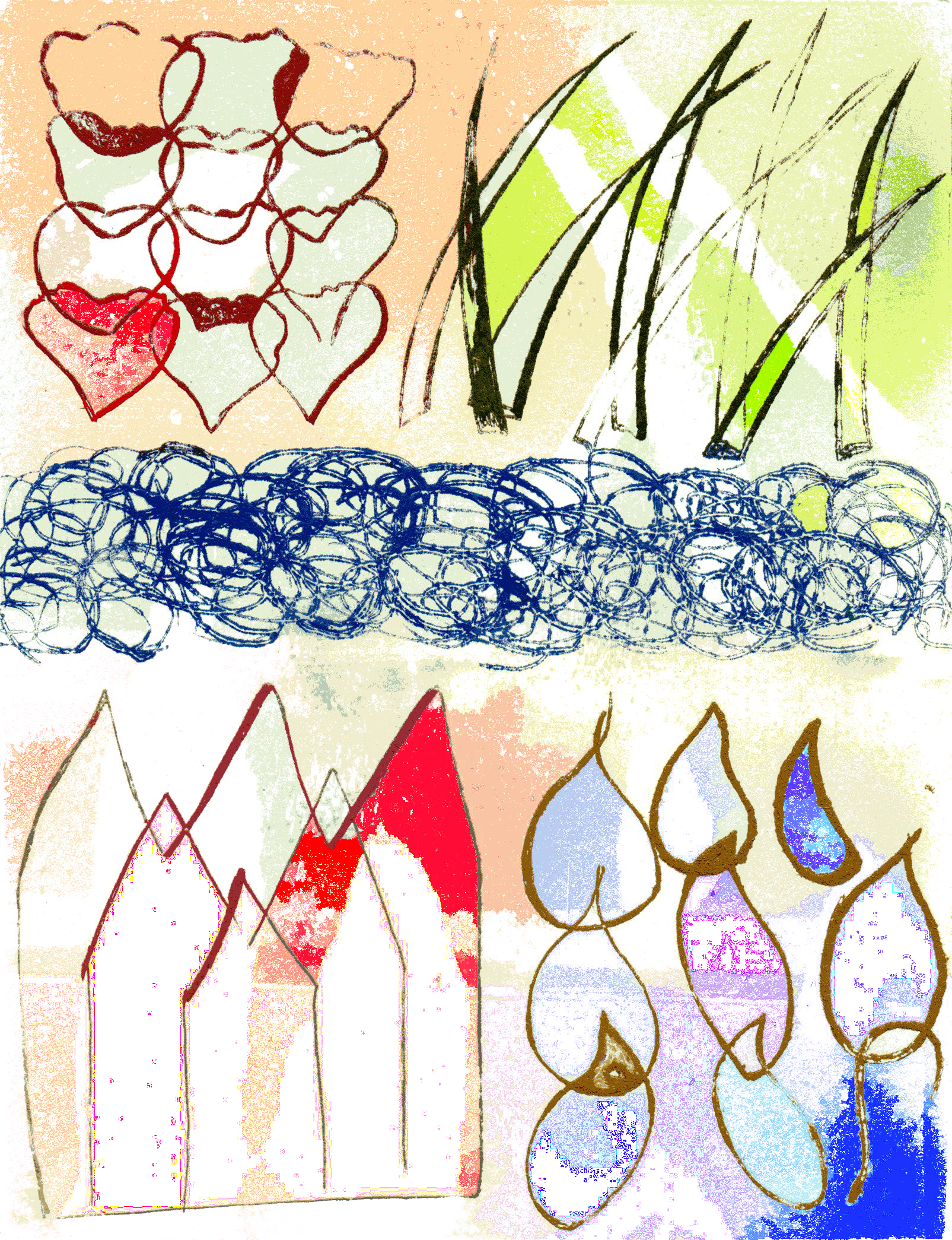 | Gemengde technieken, de naam zegt het al: dát wat ik in huis heb haal ik uit de kast. Een ets kan prima gecombineerd worden met een linodruk, op een achtergrond van lino komt een lijnets vaak prachtig tot zijn recht. Ook in combinatie met de computer zijn er talloze speelse mogelijkheden. (met watervaste inkt kan het papier nat gemaakt worden voor een etsdruk) |