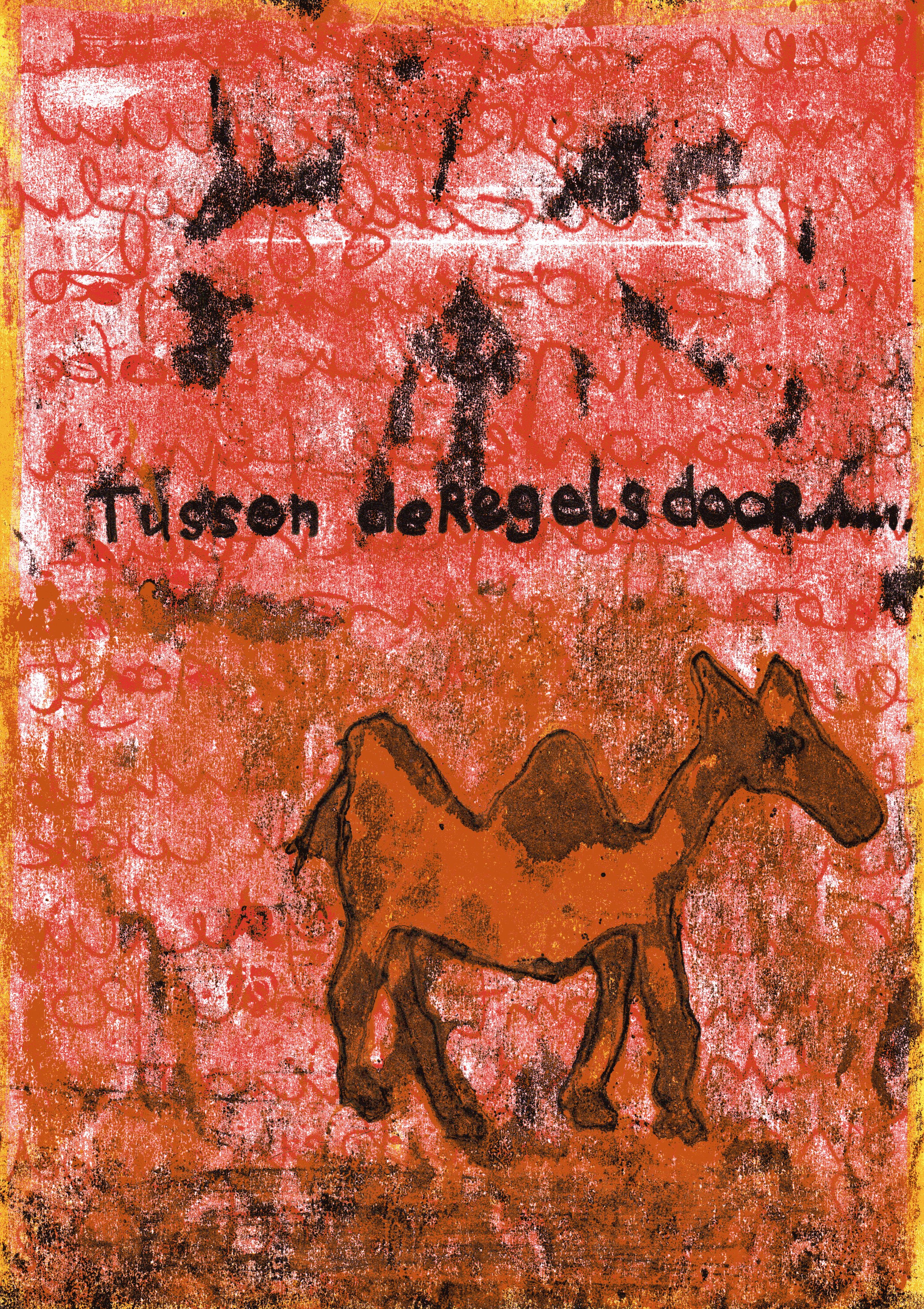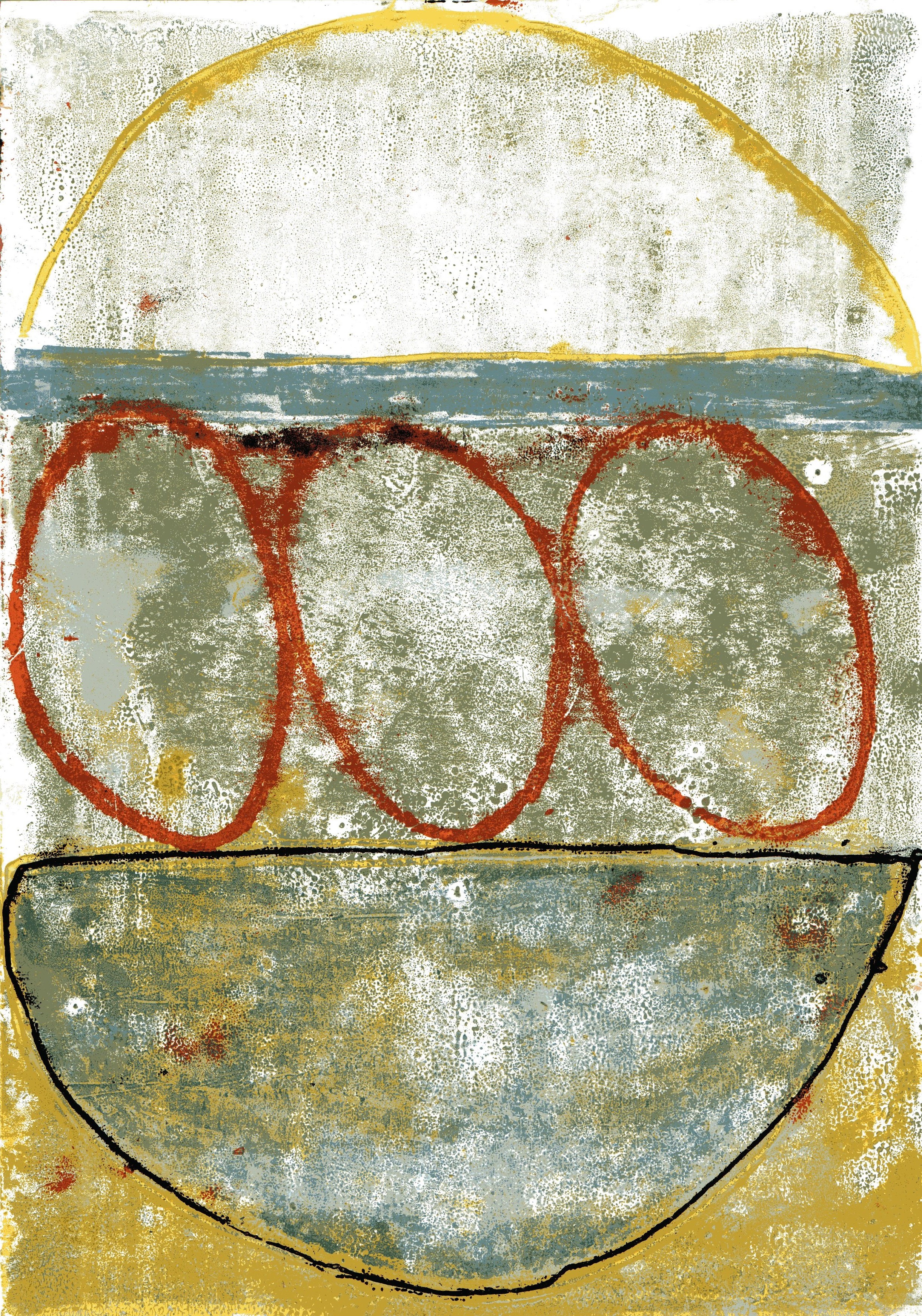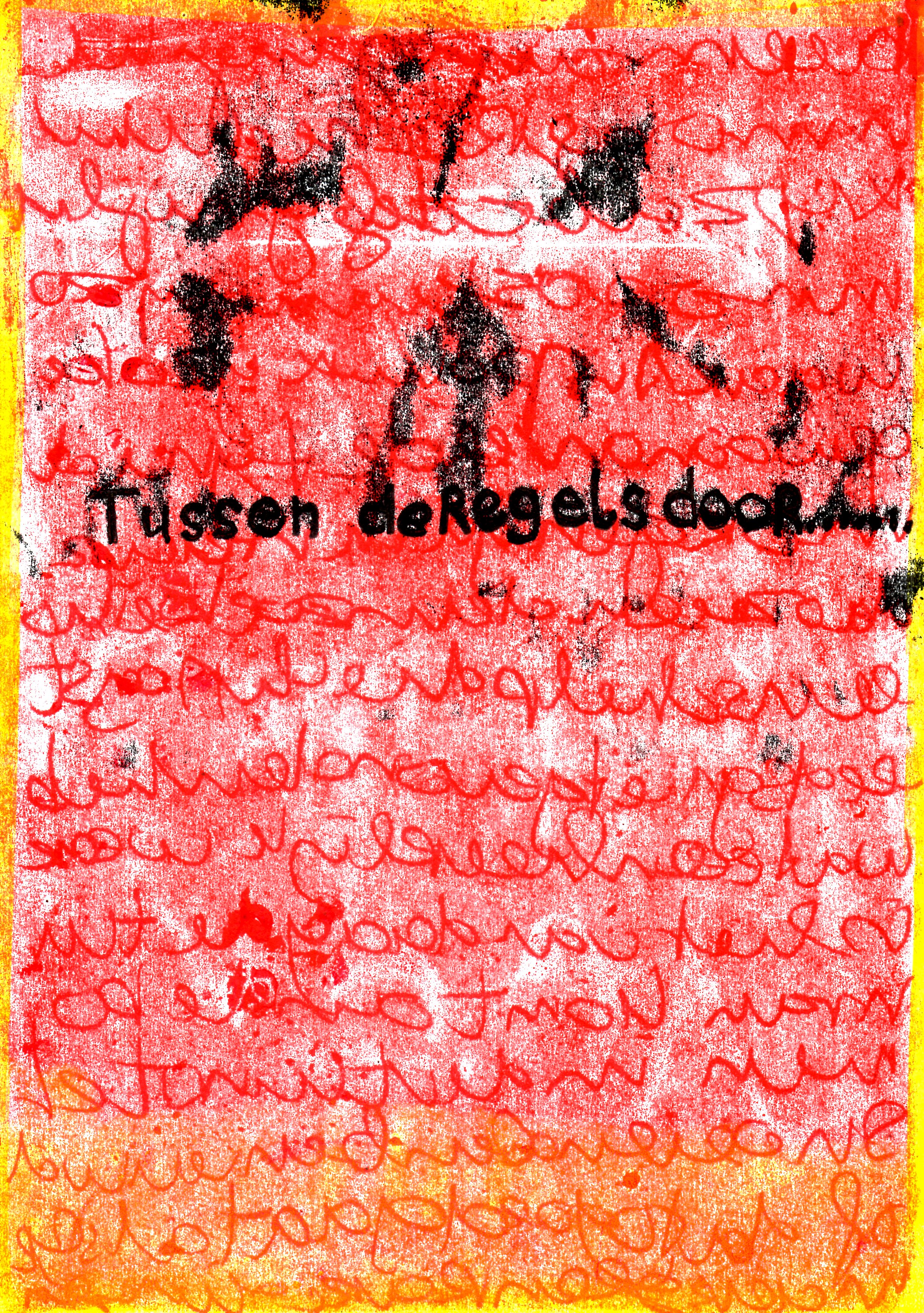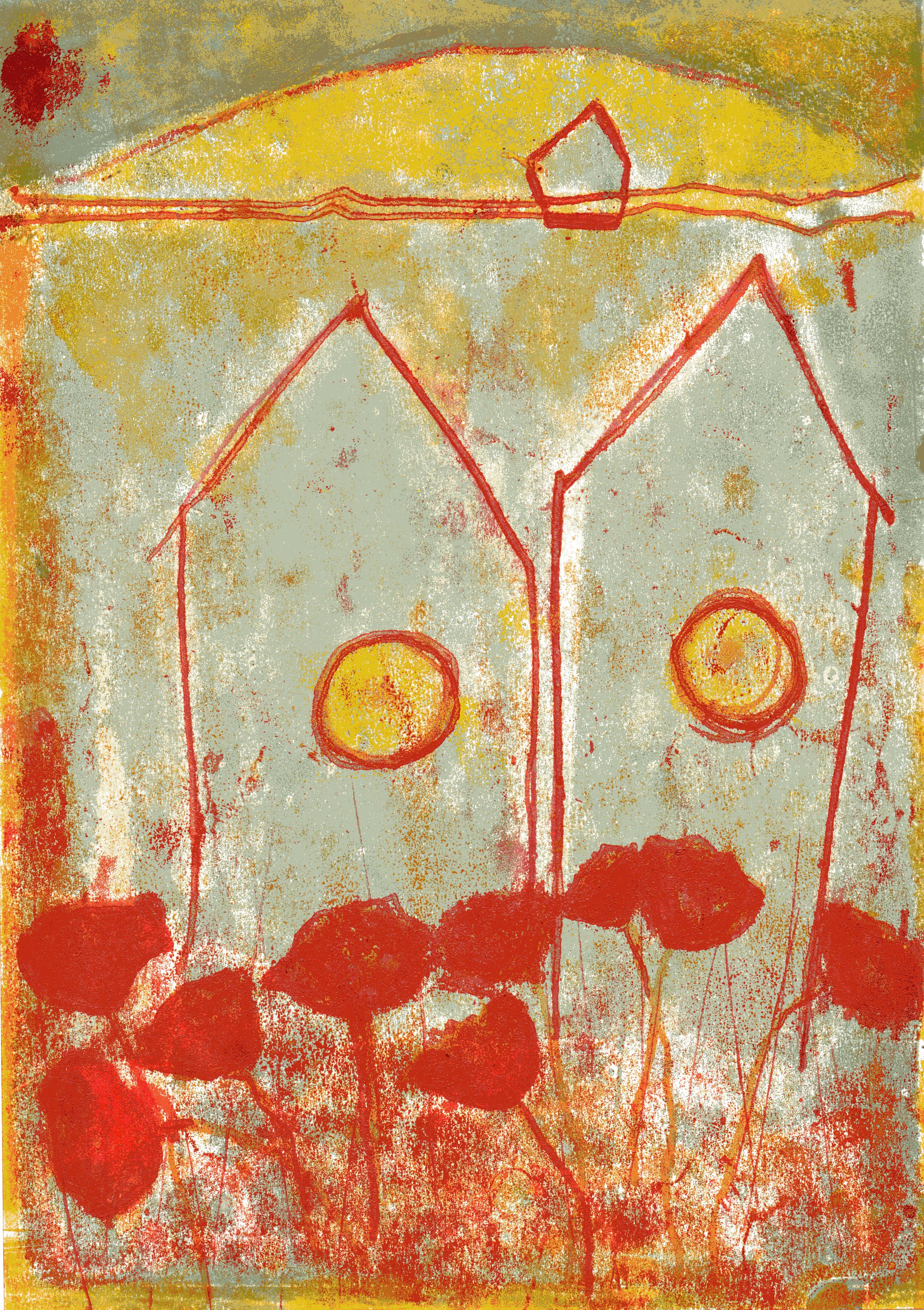 Monoprint: een eenmalige afdruk. Een tweede manier is om op een ingerolde plaat een afbeelding te "tekenen", dit kan met alles wat je maar kunt bedenken: stukje karton, een (tanden)borstel, stokje of stukje stof. Vel papier er op en wrijven of rollen. Een tweede afdruk zal altijd anders worden. |
