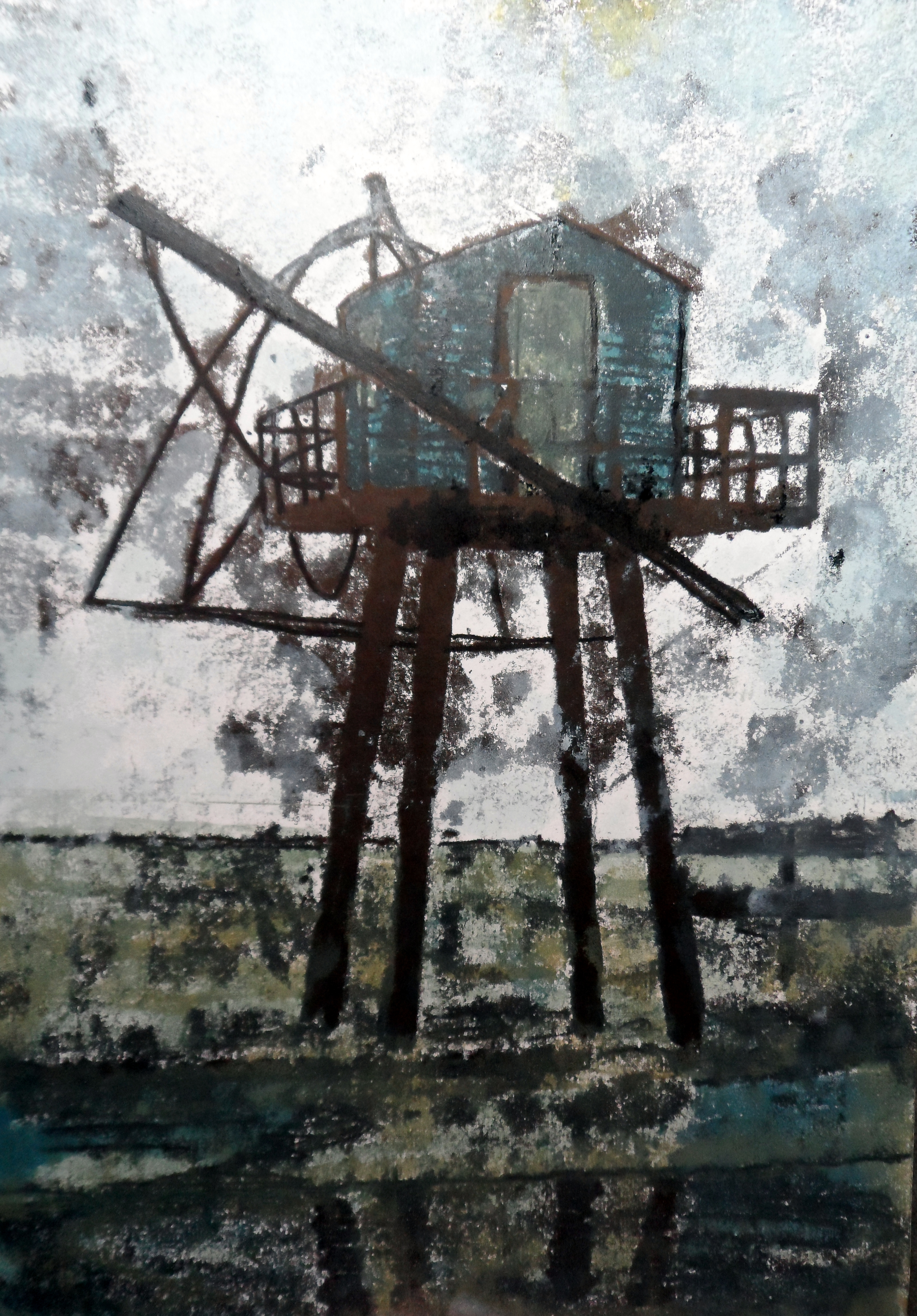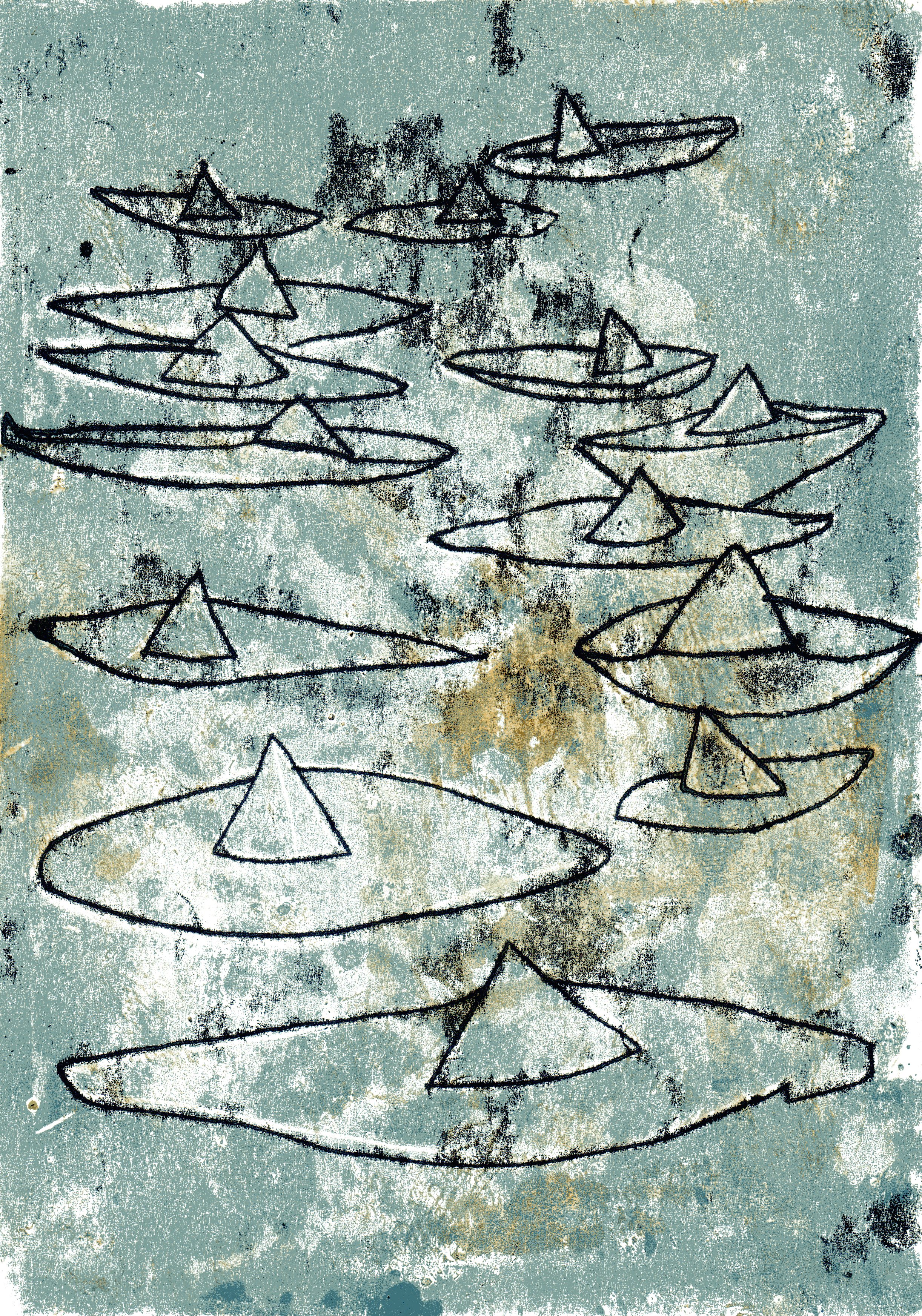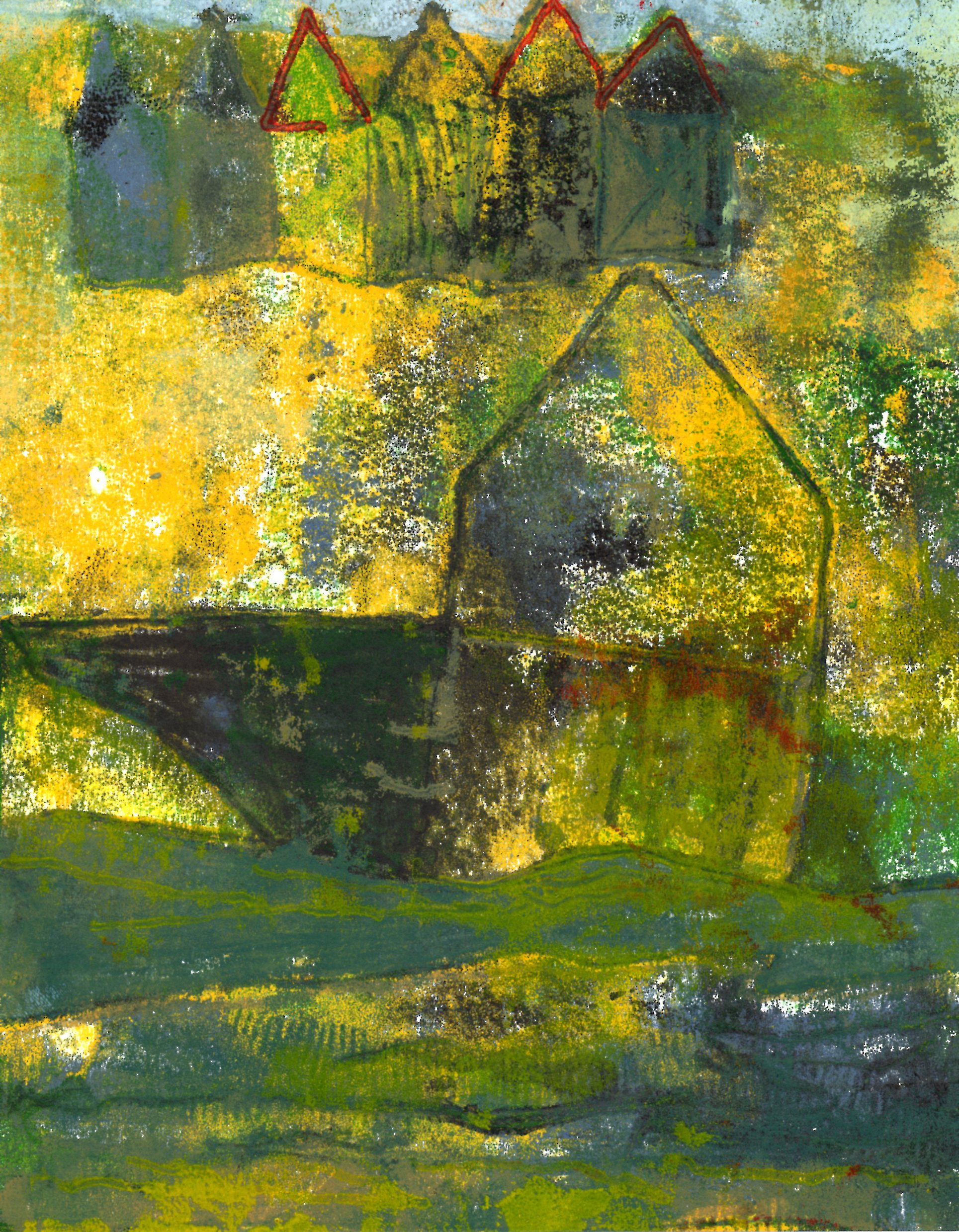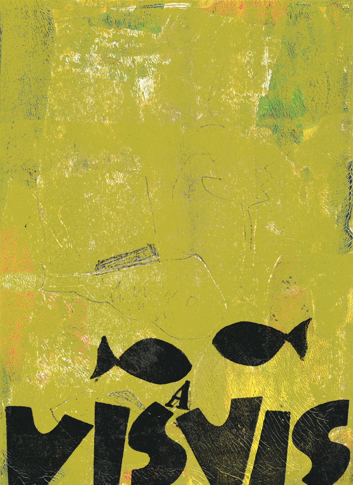 Monoprint: een eenmalige afdruk. Een tweede manier is om op een ingerolde plaat een afbeelding te "tekenen", dit kan met alles wat je maar kunt bedenken: stukje karton, een (tanden)borstel, stokje of stukje stof. Vel papier er op en wrijven of rollen. Een tweede afdruk zal altijd anders worden. |