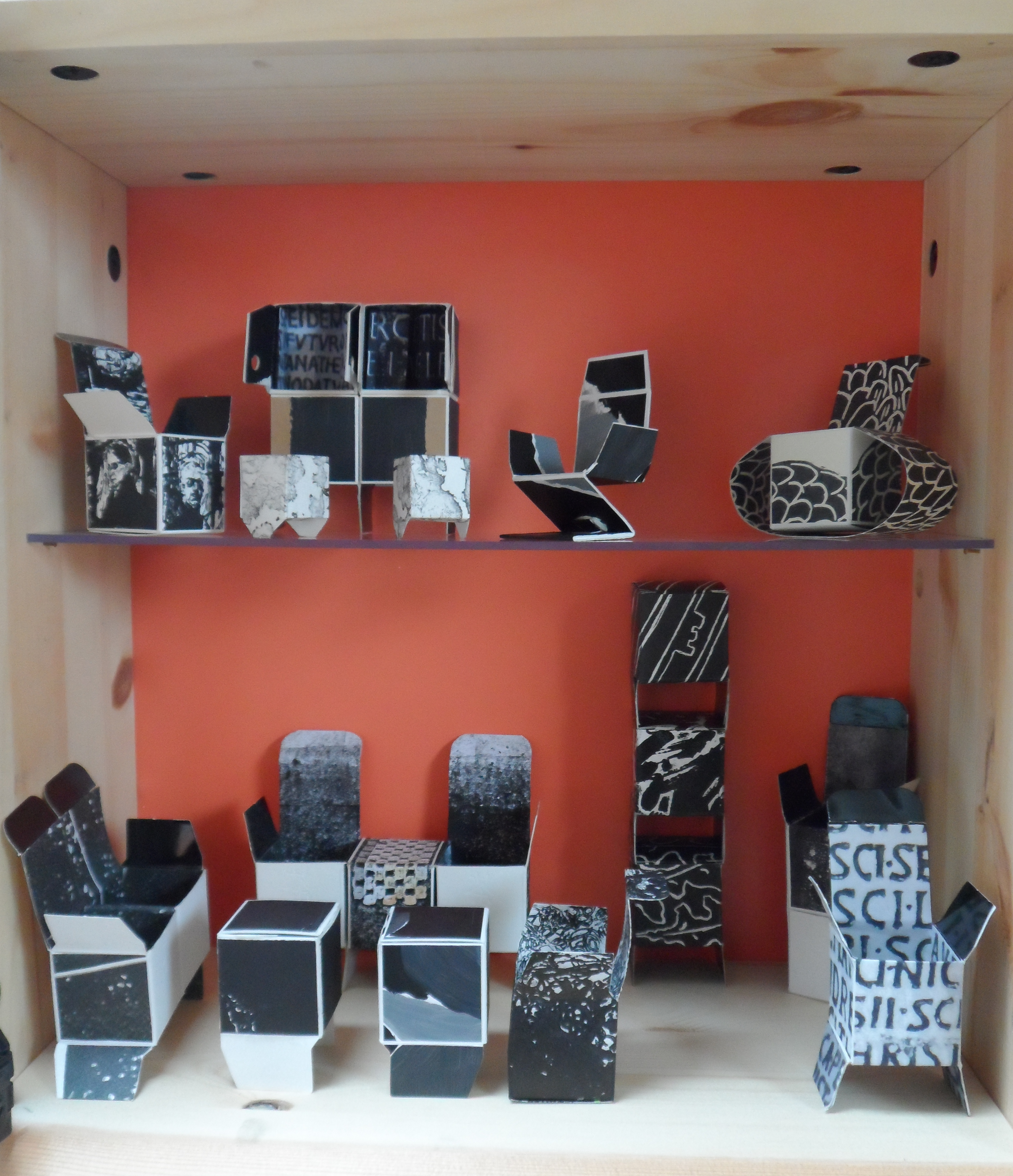 Spelen en uitproberen hoe druksels ruimtelijk werk kunnen worden. Soms verrassend en bruikbaar bij een expositie, of gewoon maar leuk.
